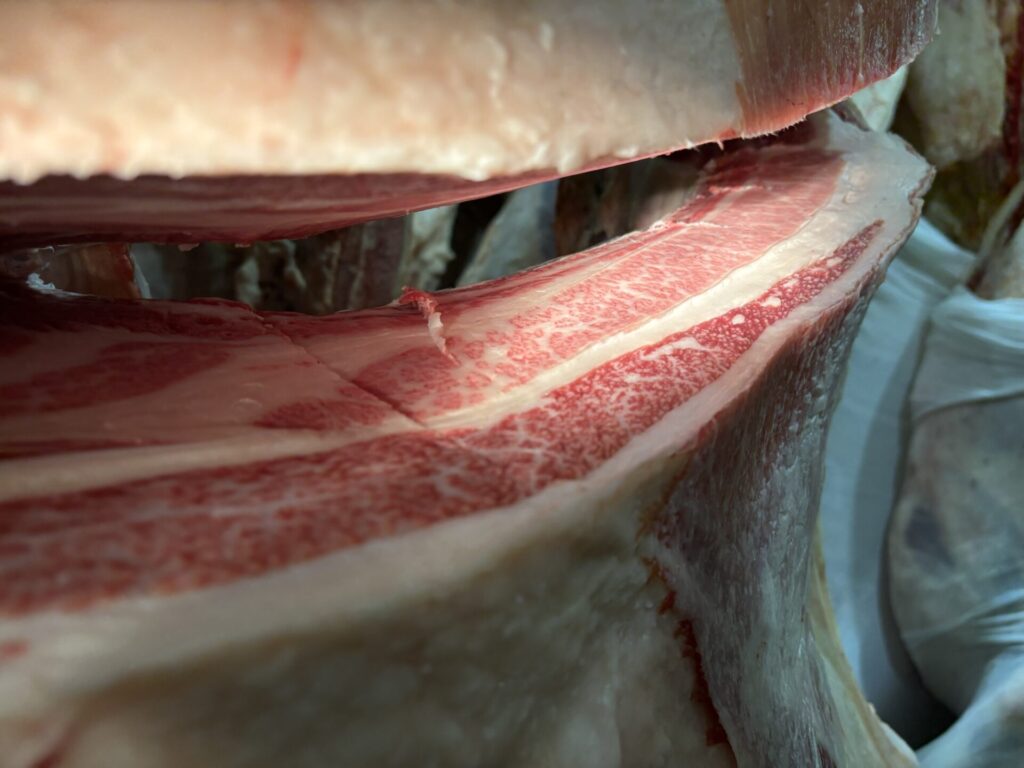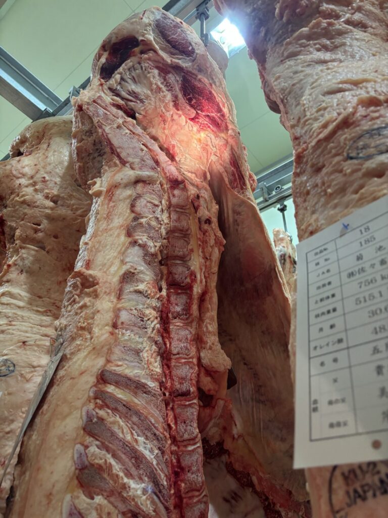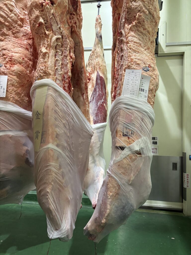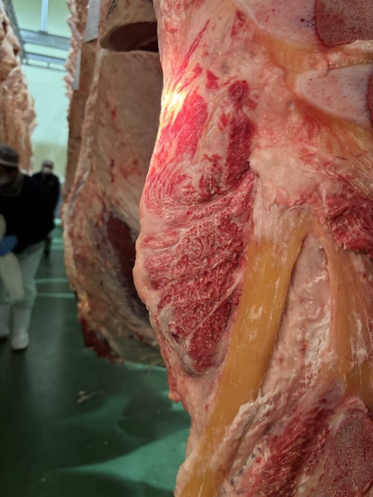 (ただ、…… 到着が遅くなり、枝肉に既にネットが掛けられてしまっていました。