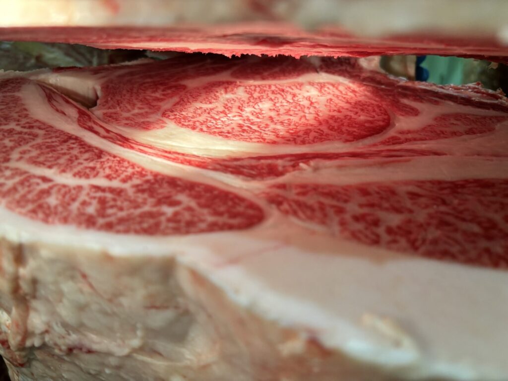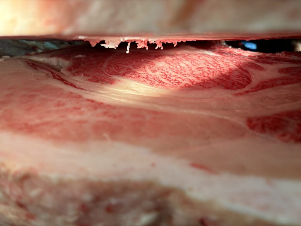 ①はBMS10ではありましたが、サシの入り方は満遍なく綺麗で、創りも良かったのです。が、若干、枝が若い感じでした。